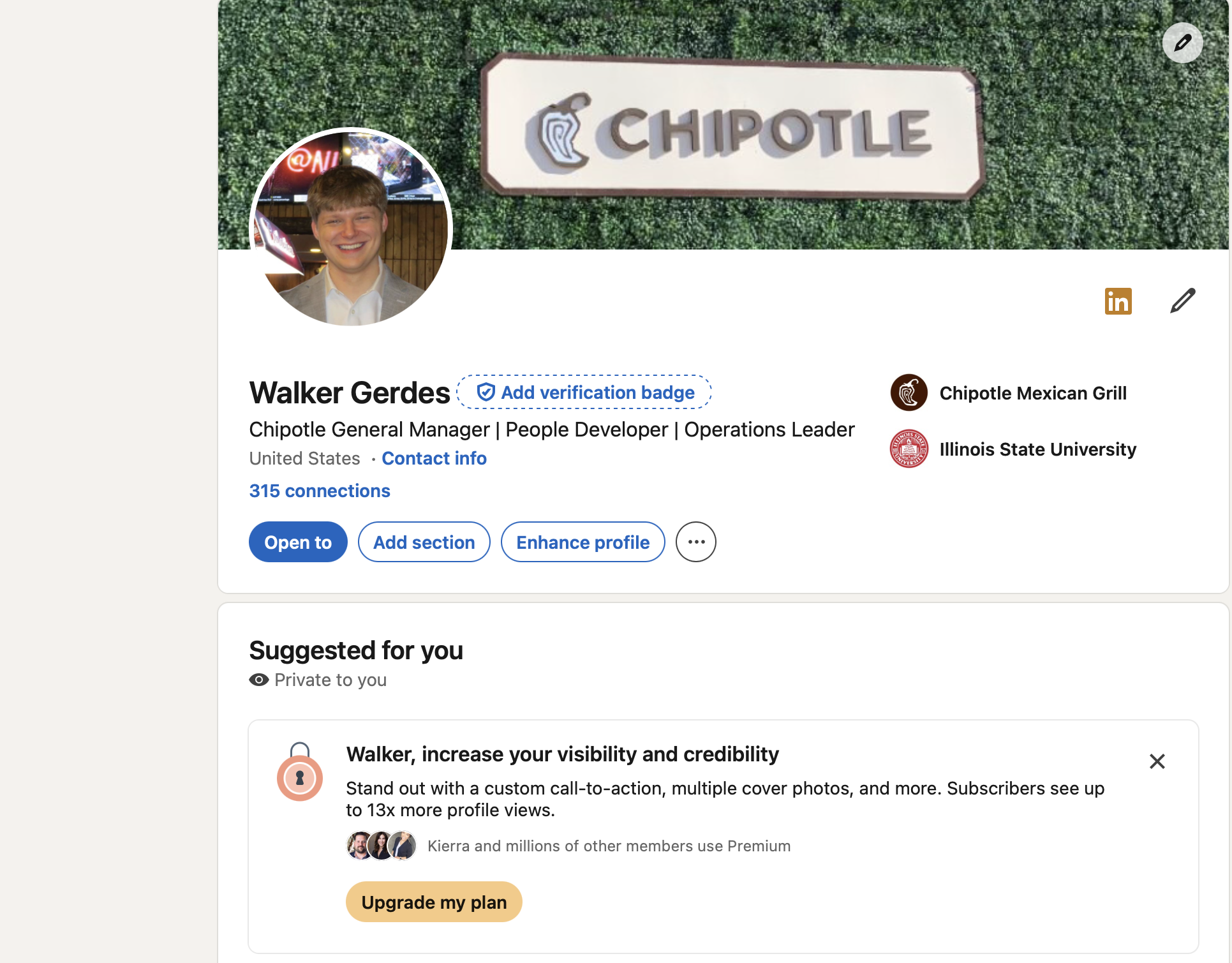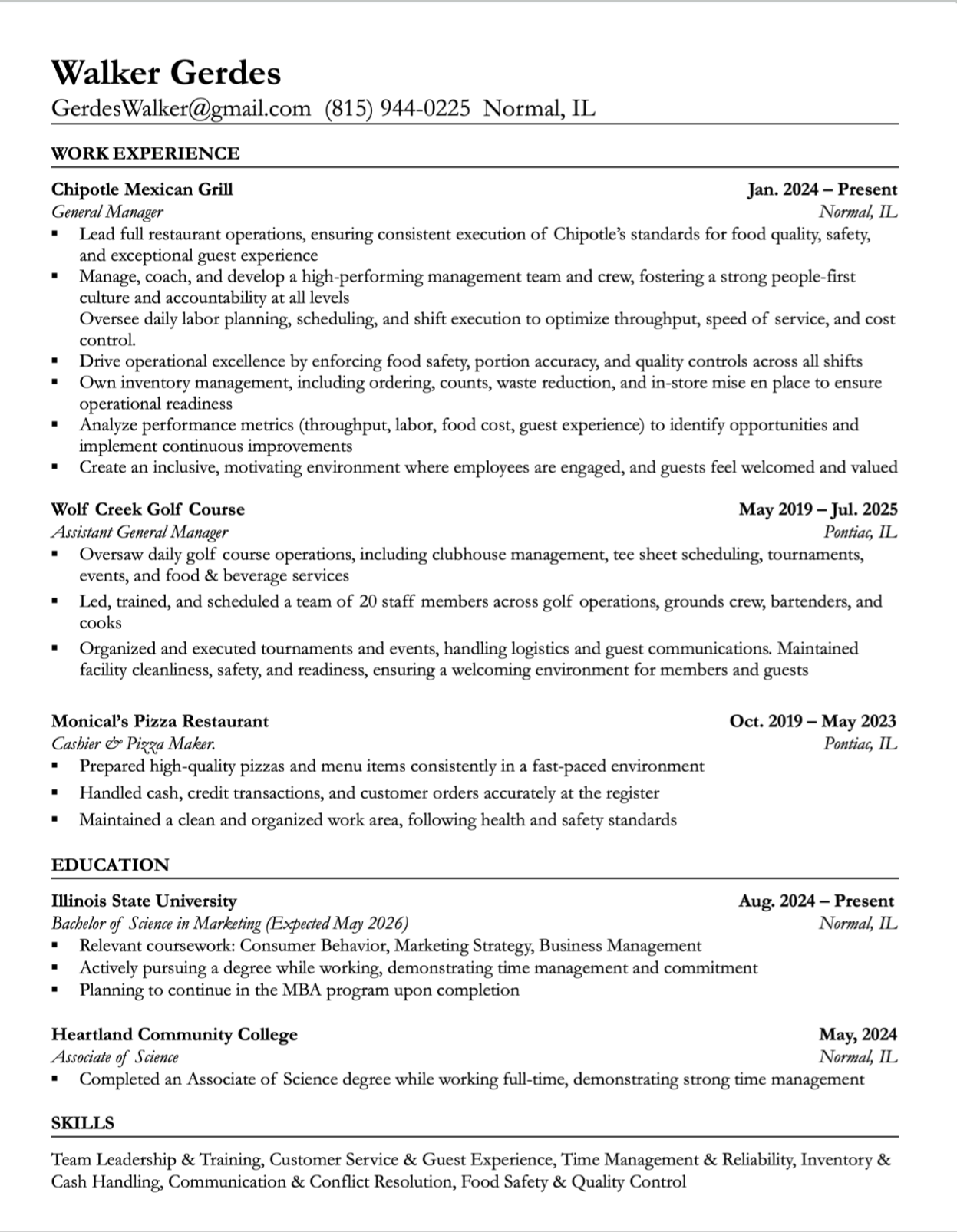 Hi, I’m Walker! A business student at Illinois State University with a passion for leadership, operations, and delivering exceptional customer experiences. I thrive in fast-paced environments where I can lead teams, solve problems, and drive results. I work as a General Manager at Chipotle, I specialize in team development, operational efficiency, and creating a strong, positive culture that leads to high performance. I’ve gained hands-on experience managing people, improving processes, and consistently pushing toward business goals. With a strong interest in sales and business development, I’m excited to build a career where I can combine leadership, strategy, and relationship-building to create lasting impact and drive growth.